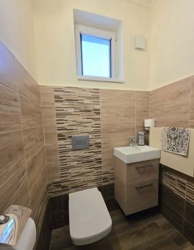 A lakrészek szépen felújítottak, a nappali világos, tágas, ahol a meghittség és az elegancia találkozik. A tér központi éke a nappaliban található hangulatos kandalló, és a lenyűgöző kiemelt fa kupolás tető, a természetes anyagok melegsége öleli át a teret.
