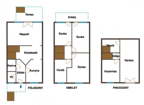 Első emelet: 3 hálószoba, ablakos fürdőszoba (WC, mosdó, zuhanykabin), az egyik hálószobához 2,5 m²-es erkély kapcsolódik.
