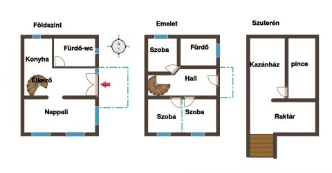 Az emeleten alaprajz szerint 3 szoba kapott helyet (jelenleg 2 szobaként használva, könnyen visszaalakítható), valamint egy hall, zuhanyzós fürdőszoba és egy felső terasz.