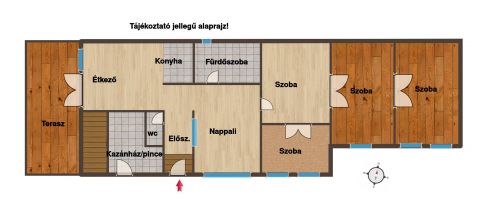 Elrendezése a következő: az előszobából a nappaliba léphetünk, innen nyílik további 4 jó méretű szoba  keleti tájolással, a másik irányból  tágas konyha/étkező és a kertre néző hangulatos terasz közelithető meg déli  tájolással. A két utcafronti szoba felújitást igényel: üzleti célra vagy másik generációnak való saját lakrész kialakitására kiválóan alkalmas, és a céltól függően az udvar is szekcionálható. Mindez egyszinten, lépcsők nélkül, minimális befektetéssel akadálymentes élettér is kialakítható.