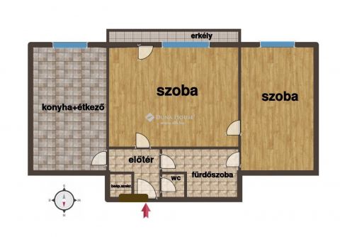 Az 55 nm alapterületű 2. emeleti lakás belső kialakítása praktikus, élhető: az erkélyes nappali mellett egy kisebb szoba biztosít helyet a pihenésre. A fürdőszoba 2 oldalról is megközelíthető, így a lakást gyakorlatilag körbe tudjuk járni. A bejárattól balra pedig a konyha- étkező található.