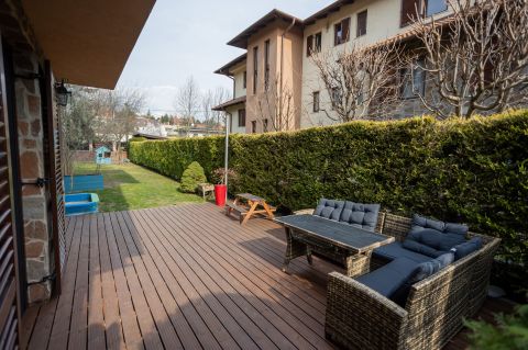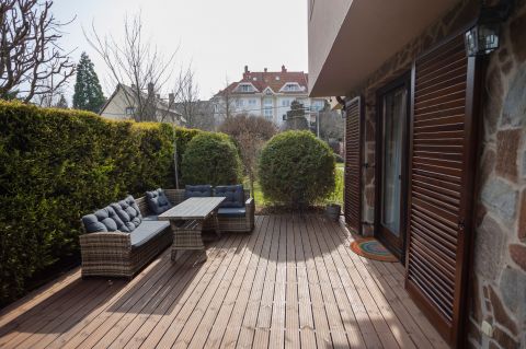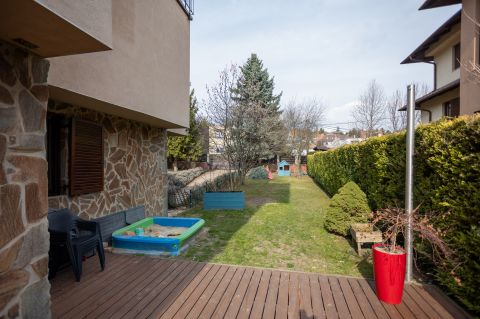 Az ingatlanhoz tartozik egy tágas, ~24 m²-es terasz, amely tökéletes helyszín reggeli kávézáshoz vagy esti kikapcsolódáshoz, illetve egy 124 m² kertkapcsolat.
